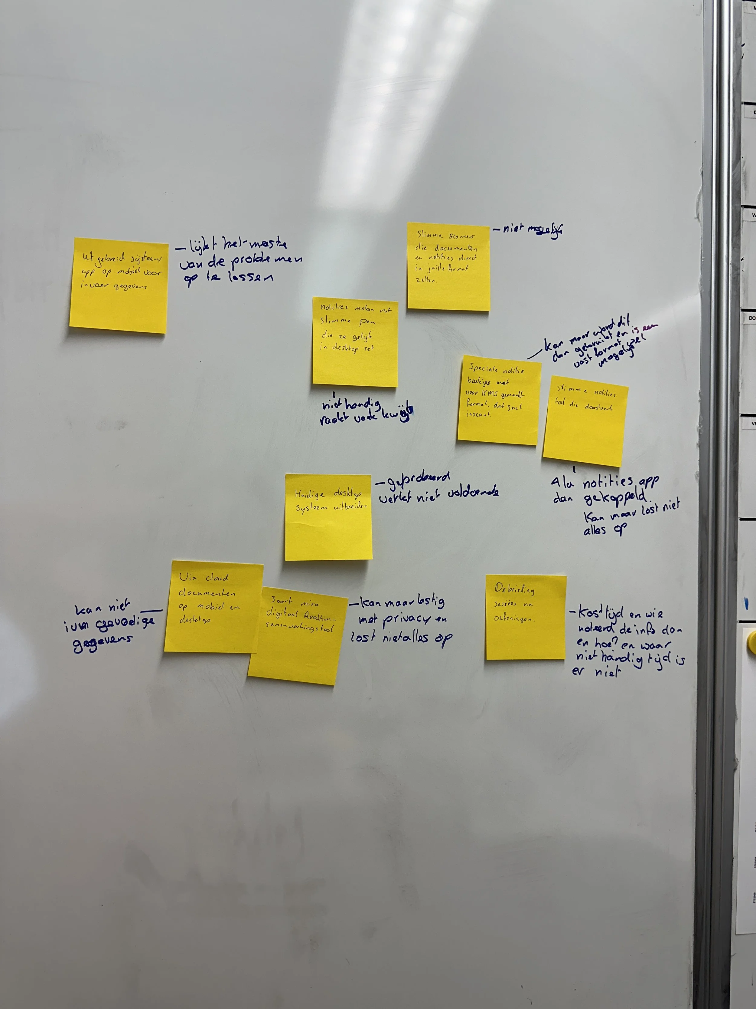 Een klein inkijkje in dit project kan ik wel geven. Nadat ik met de doelgroep het probleem had vastgesteld zijn we met post-its gewoon ideeën gaan gooien doormiddel van een braindump. De doelgroep heeft hierbij meegedacht en gaf ook reacties op de opgeschreven ideeën wat zou een optie zijn of wat is wenselijk of juist niet.
